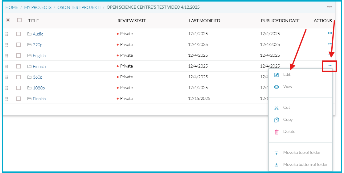- Go to the media page of the given video or audio file and select the edit option from the left side menu (see part C. Edit media pages)